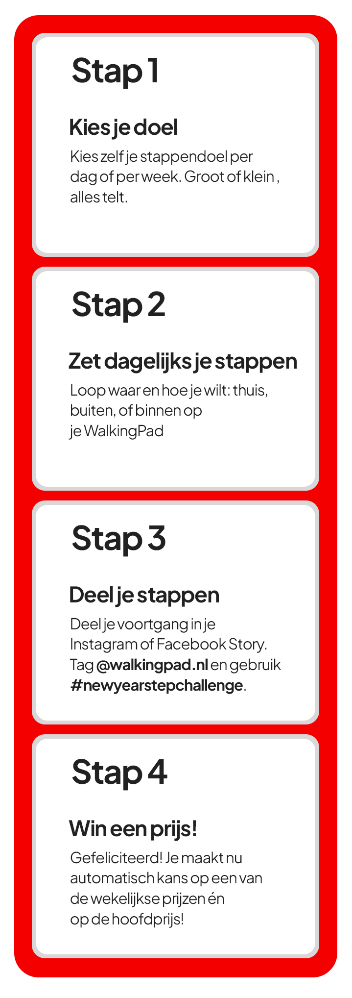 Nee! Het is niet alleen voor gebruikers van een walkingpad. Als je al een walkingpad hebt en daarnaast de gelukkige winnaar wordt van een loopband tijdens de challenge, mag je zelf kiezen: je kunt kiezen voor een volledige cashback of voor het ontvangen van de nieuwe loopband!