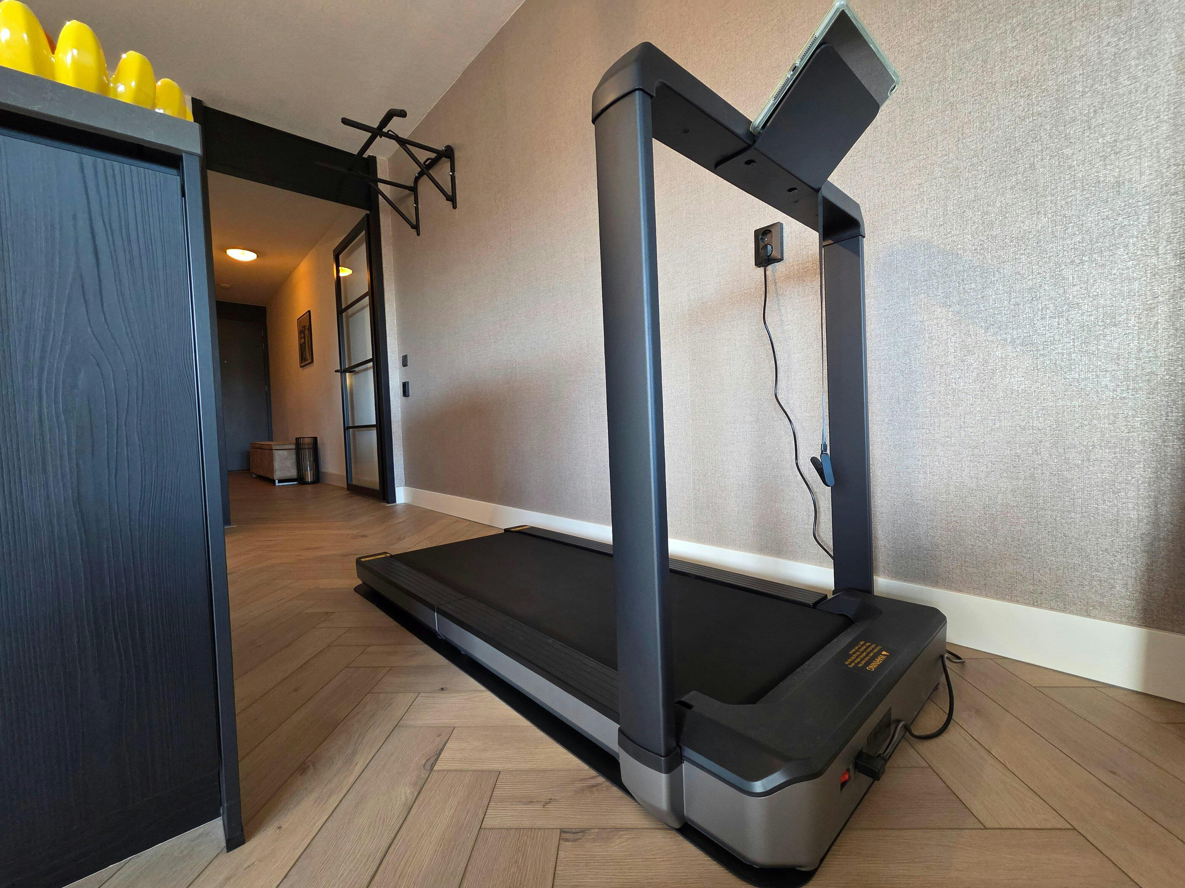 Na het uitklappen sluit je de loopband aan op het stopcontact. Je kunt direct starten via de snelheidsknop op het handvat of met de bijbehorende app. Je hoeft niets te installeren: gewoon aansluiten en gaan.